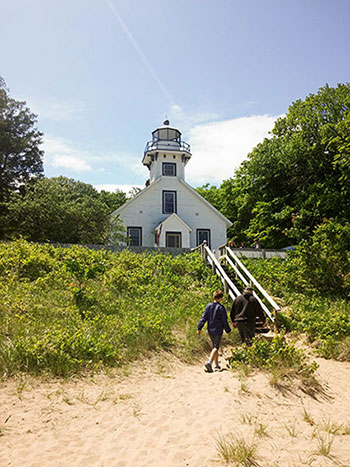 Mission Point Lighthouse – Mission Point Light is at the tip of Old Mission Peninsula. The peninsula juts out into Grand Traverse Bay, north of Traverse City. This lighthouse looks like a regular two-story clapboard house, but a light tower rises above the roofline. Inside the lighthouse, museum displays tell the story of the light and keepers who lived there. You can climb the tower and look out over Grand Traverse Bay. You can also explore the lighthouse grounds and outbuildings.